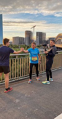 Ankerplatz Frankfurt Liebeserklärung an den Frankfurt Marathon Stadtkirche Videograf Markus Laubvogel (r.) bei der Arbeit mit Pfarrer Peter Noss (Mitte) und einem der Läufer. FRANKFURT, 07.10.2021 Lie