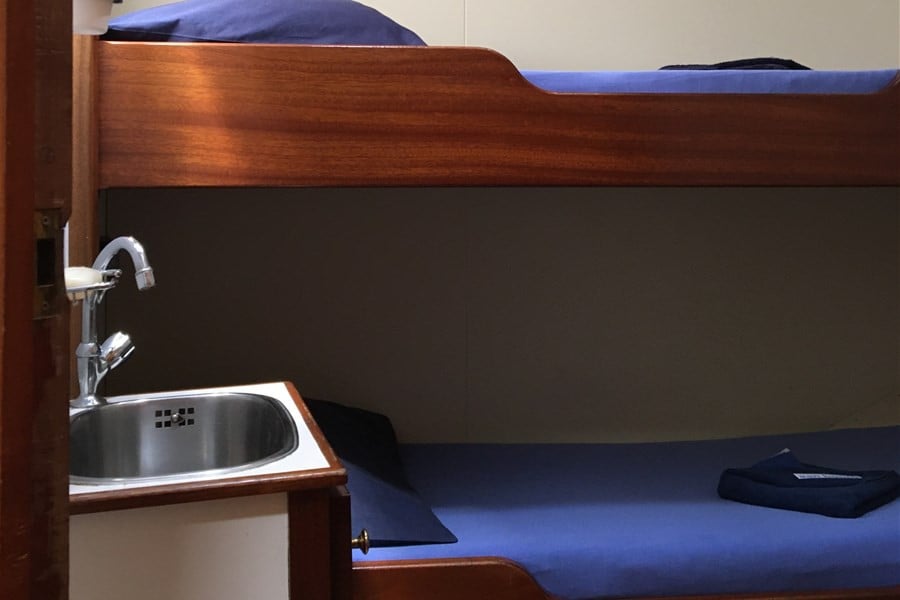 Übernachtet wird auf dem Schiff in wahlweise zwei- oder drei-Bett Kabinen mit jeweils einzelnen Kojen. Die Ausstattung der Kabinen ist einfach und funktional. Die Kabinen verfügen jeweils über eine Waschgelegenheit und Heizung für kühlere Abende. Duschen und WCs gibt es auf dem Gang neben den Kabinen. Ähnlich wie beim Camping haben die Häfen, die wir anlaufen Duschmöglichkeiten, die morgens und abends genutzt werden können.